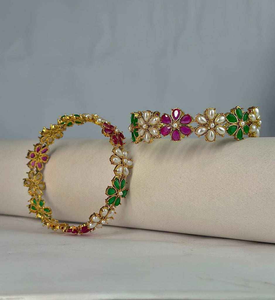 Elevate your style with these exquisite Dual Elegance Bangles, featuring a beautiful blend of gold and silver with vibrant floral designs. Designed for women and girls who appreciate timeless beauty, these bangles are perfect for both special occasions and daily wear.